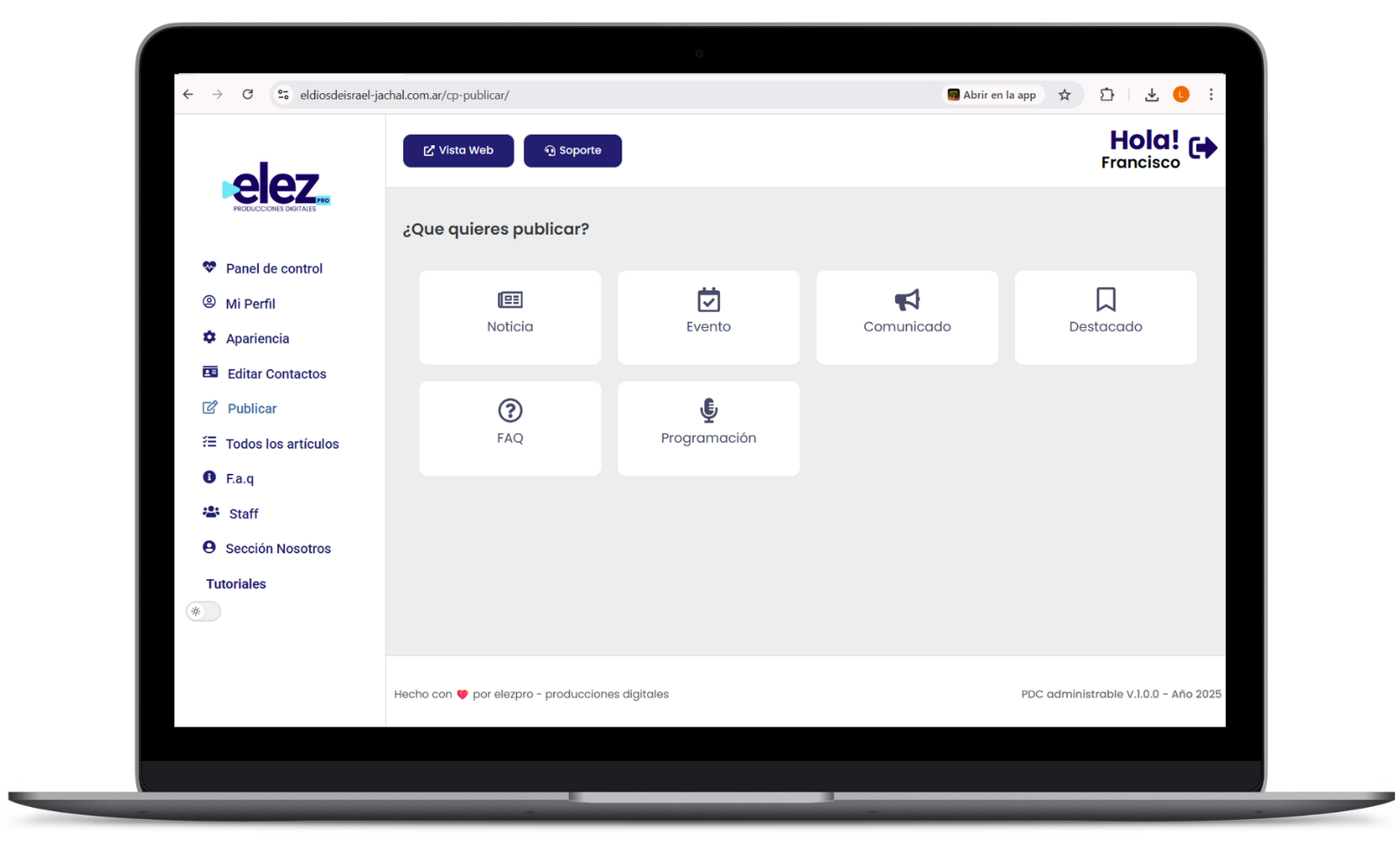 Panel De Contenidos Administrable y personalizado exclusivo de ElEzPro. Contiene un diseño amigable para publicar tus noticias o artículos. Puedes manipular el panel desde PC, Notebook y Dispositivo Movil.